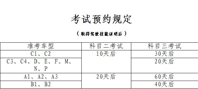 那么,在取得驾驶技能证明后的考试预约规定您了解吗?今天,我们就来说说考试预约规定。分别是关于科目二、科目三考试的各项驾驶证类型的预约规定。