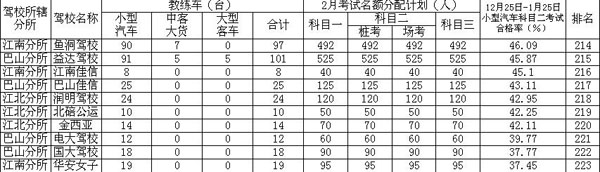 2、全市参加排名的驾校共计223所,科目二考试合格率第一名为江东驾校,第二名为泰安驾校,第三名为酉阳溢城驾校,第四名为涪陵川涪驾校,第五名为彭水光明驾校,第六名为新马达驾校,第七名为金泰驾校,第八名为秀山弘达驾校,第九名为玲珑驾校,第十名为忠县神运驾校。