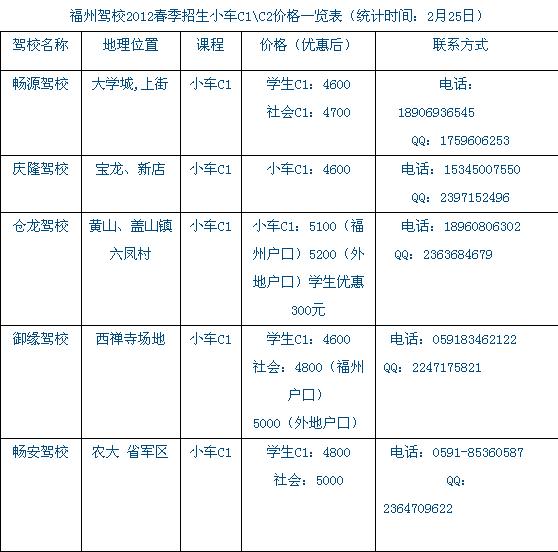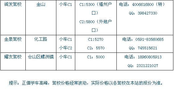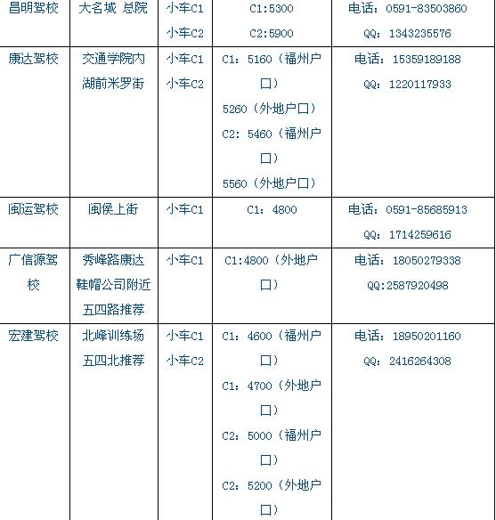 福州各驾校最新考驾照价格列表