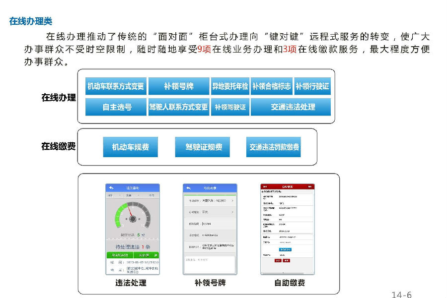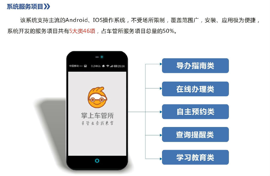 答:“掌上车管所”是广大交通参与者利用智能手机和平板电脑来及时了解和办理各项车驾管业务的平台,随时随地、轻松办理车驾管业务,享受提醒、告知、导办、违法处理等个性贴心车管服务,是办事群众“随身携带的车管所”。